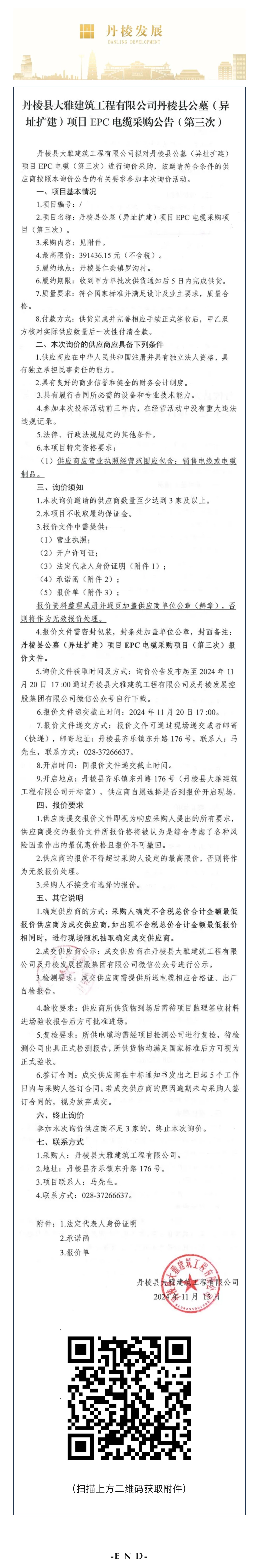 丹棱縣大雅建筑工程有限公司丹棱縣公墓(異址擴建)項目EPC電纜采購公告(第三次)