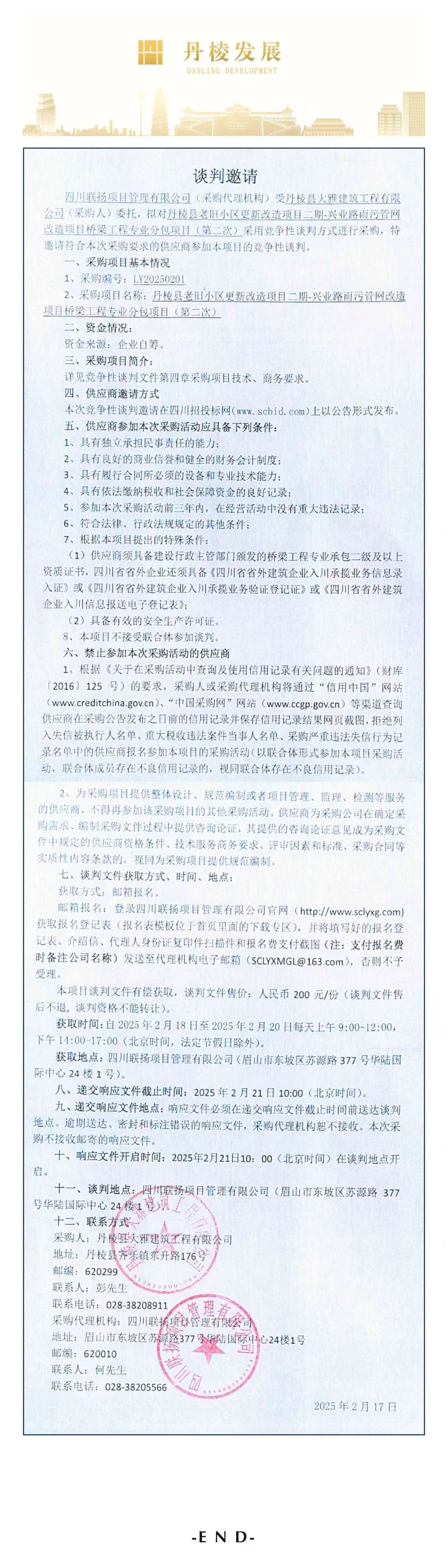 丹棱縣老舊小區(qū)更新改造項(xiàng)目二期-興業(yè)路雨污管網(wǎng)改造項(xiàng)目橋梁工程專業(yè)分包項(xiàng)目談判邀請(qǐng)公告(第二次)