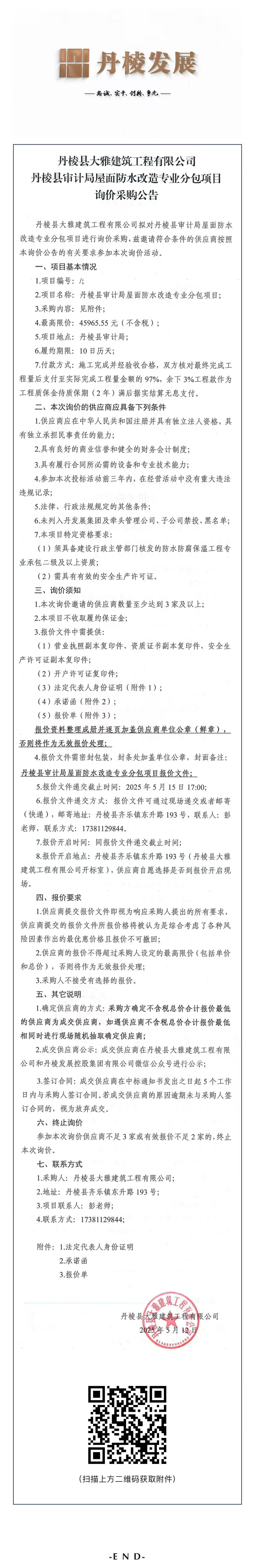 丹棱縣大雅建筑工程有限公司丹棱縣審計(jì)局屋面防水改造專業(yè)分包項(xiàng)目詢價(jià)采購(gòu)公告