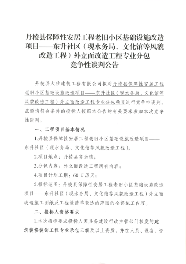 【大雅建筑公司】丹棱縣保障性安居工程老舊小區(qū)基礎(chǔ)設(shè)施改造項目--東升社區(qū)(現(xiàn)水務(wù)局、文化館等風(fēng)貌改造工程)外立面改造工程專業(yè)分包競爭性談判公告