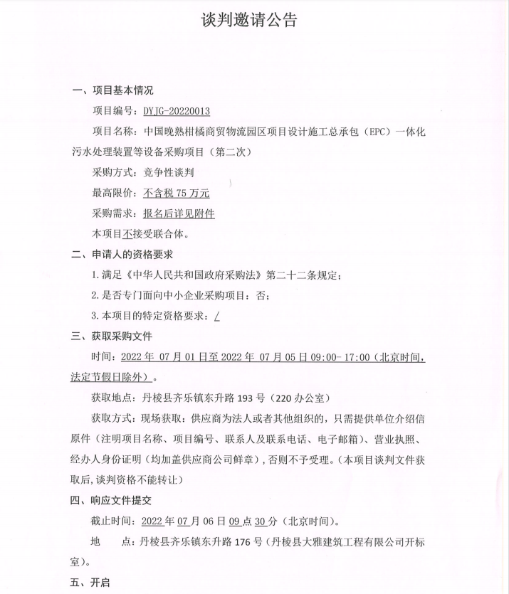 中國(guó)晚熟柑橘商貿(mào)物流園區(qū)項(xiàng)目設(shè)計(jì)施工總承包(EPC)一體化污水處理裝置等設(shè)備采購(gòu)項(xiàng)目第二次談判邀請(qǐng)公告