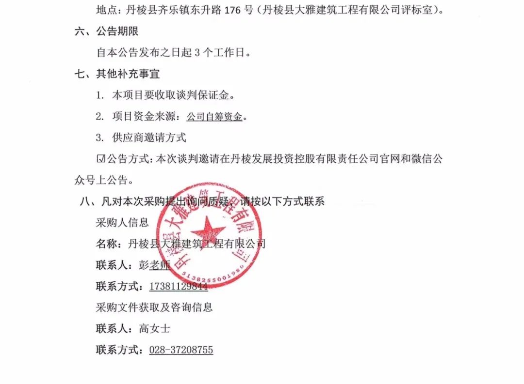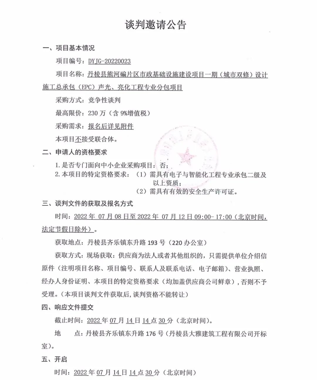丹棱縣熊河碥片區(qū)市政基礎(chǔ)設施建設一期(城市雙修)設計施工總承包(EPC)聲光、亮化工程專業(yè)分包項目談判邀請公告