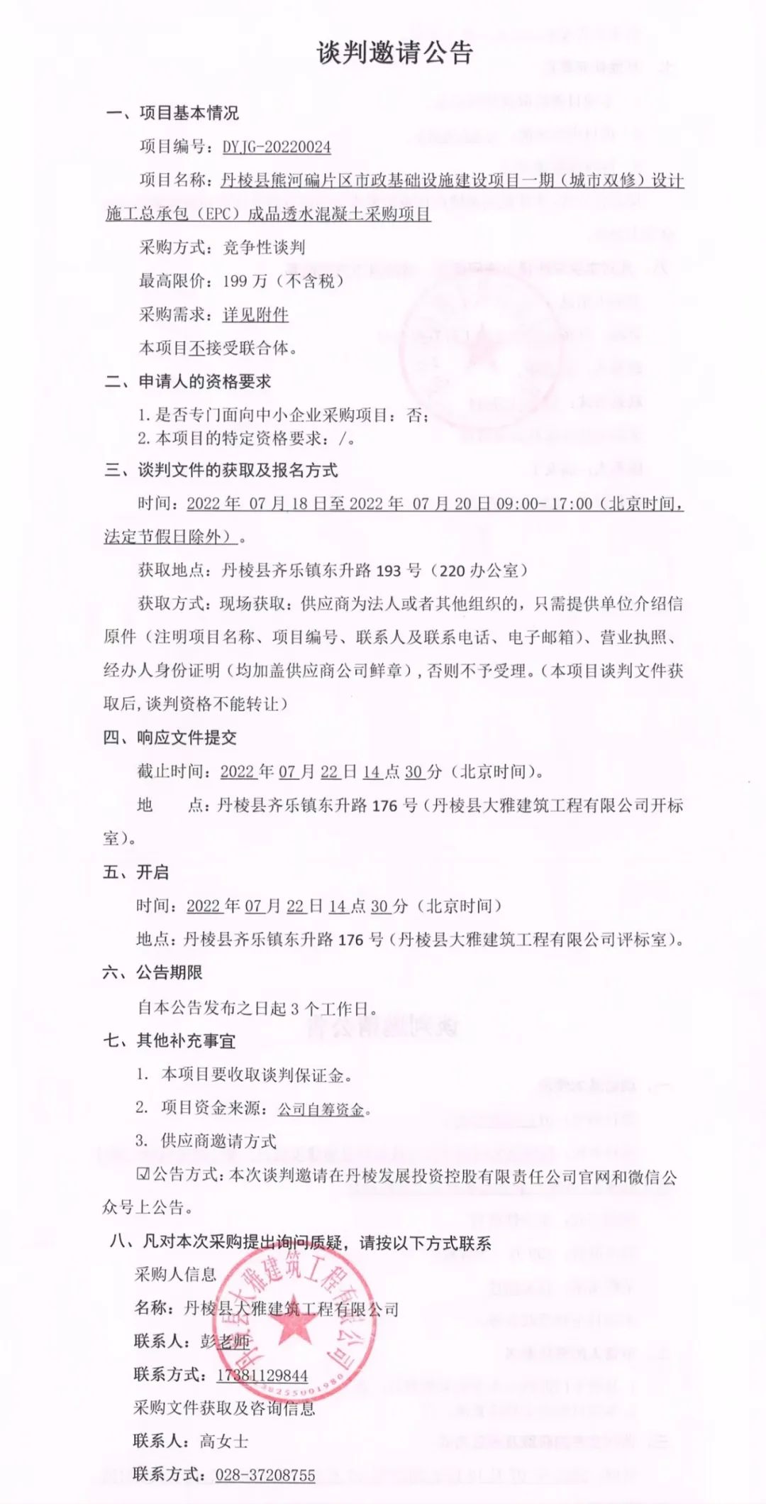 丹棱縣熊河碥片區(qū)市政基礎(chǔ)設(shè)施建設(shè)項目一期(城市雙修)設(shè)計施工總承包(EPC)成品透水混凝土采購項目談判邀請公告