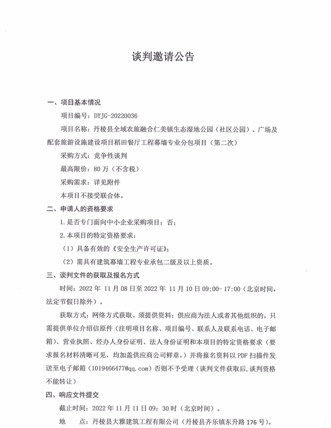 丹棱縣全域農(nóng)旅融合仁美鎮(zhèn)生態(tài)濕地公園(社區(qū)公園)、廣場及配套旅游設(shè)施建設(shè)項(xiàng)目稻田餐廳工程幕墻專業(yè)分包項(xiàng)目(第二次)談判邀請公告