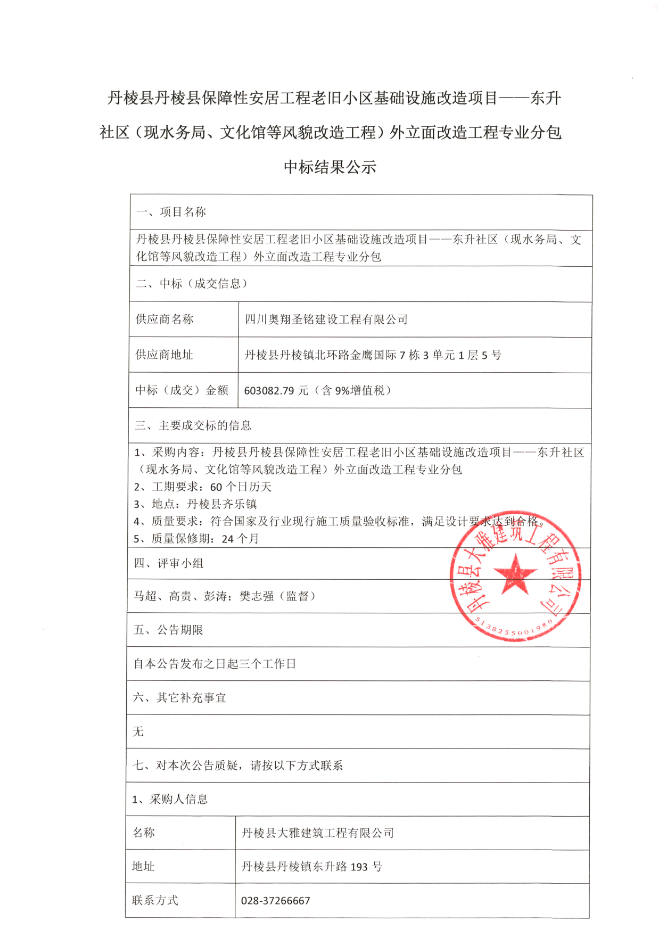 【大雅建筑公司】丹棱縣保障性安居工程老舊小區(qū)基礎(chǔ)設(shè)施改造項目--東升社區(qū)(現(xiàn)水務局、文化館等風貌改造工程)外立面改造工程專業(yè)分包中標結(jié)果公示