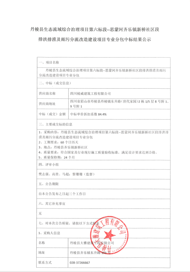 【大雅建筑公司】丹棱縣生態(tài)流域綜合治理項(xiàng)目第六標(biāo)段—思蒙河齊樂鎮(zhèn)新橋社區(qū)段排洪排澇及雨污分流改造建設(shè)項(xiàng)目專業(yè)分包中標(biāo)結(jié)果公示
