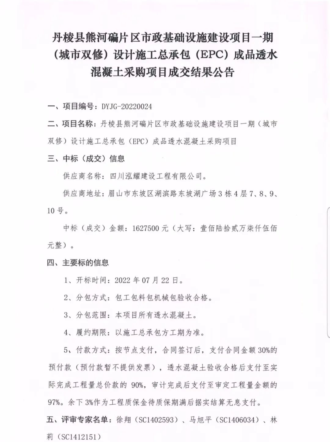 丹棱縣熊河碥片區(qū)市政基礎(chǔ)設(shè)施建設(shè)項(xiàng)目一期(城市雙修)設(shè)計(jì)施工總承包(EPC)成品透水混凝土采購項(xiàng)目成交結(jié)果公告