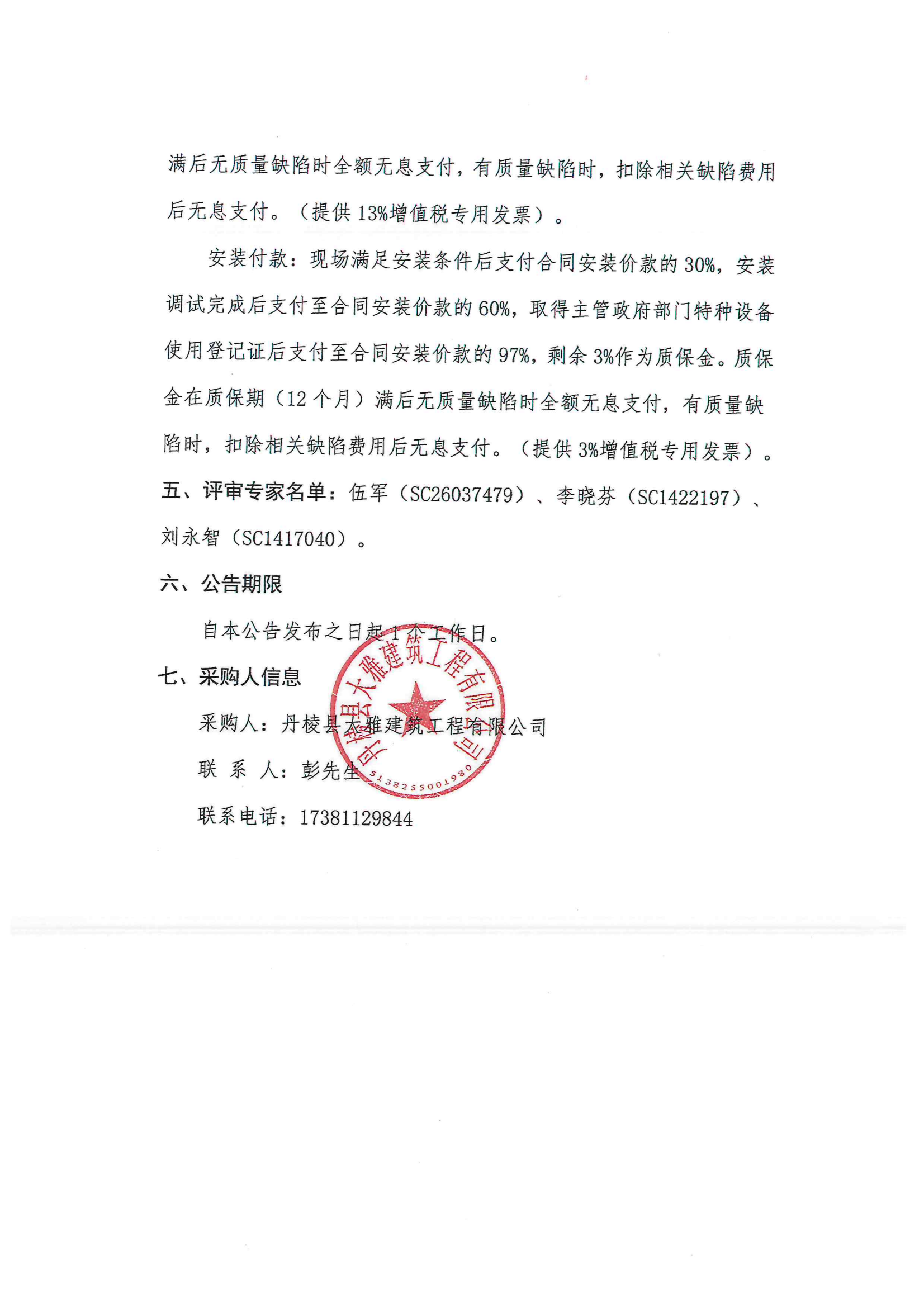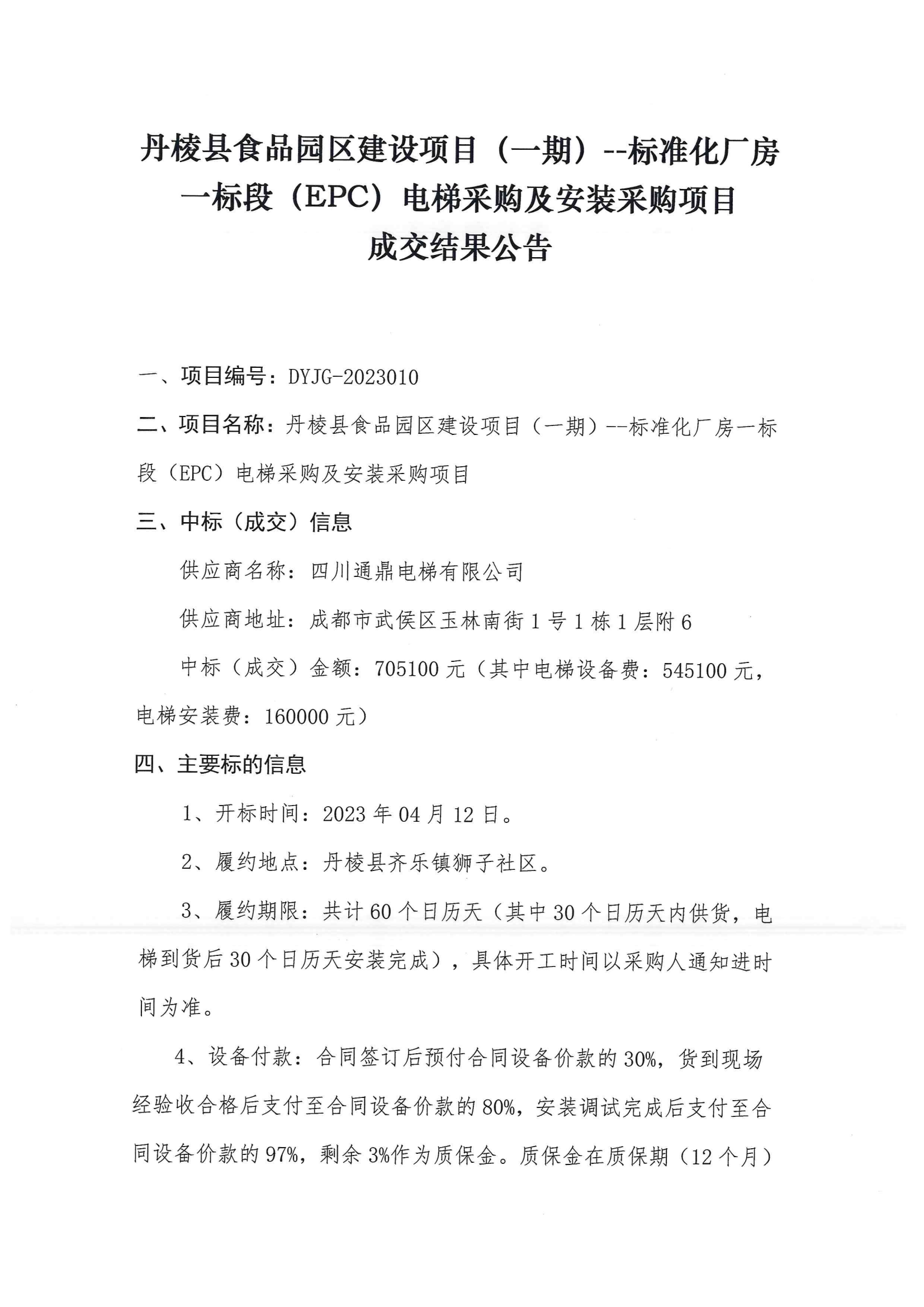 丹棱縣食品園區(qū)建設項目(一期)--標準化廠房一標段(EPC)電梯采購及安裝采購項目成交結果公告
