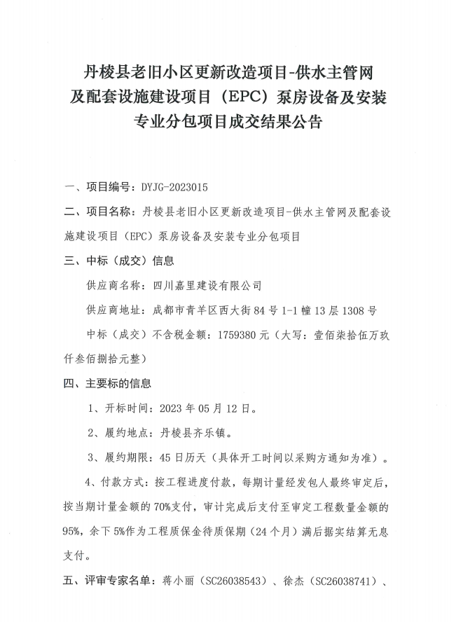 丹棱縣老舊小區(qū)更新改造項(xiàng)目-供水主管網(wǎng)及配套設(shè)施建設(shè)項(xiàng)目(EPC)泵房設(shè)備及安裝專(zhuān)業(yè)分包項(xiàng)目成交結(jié)果公告