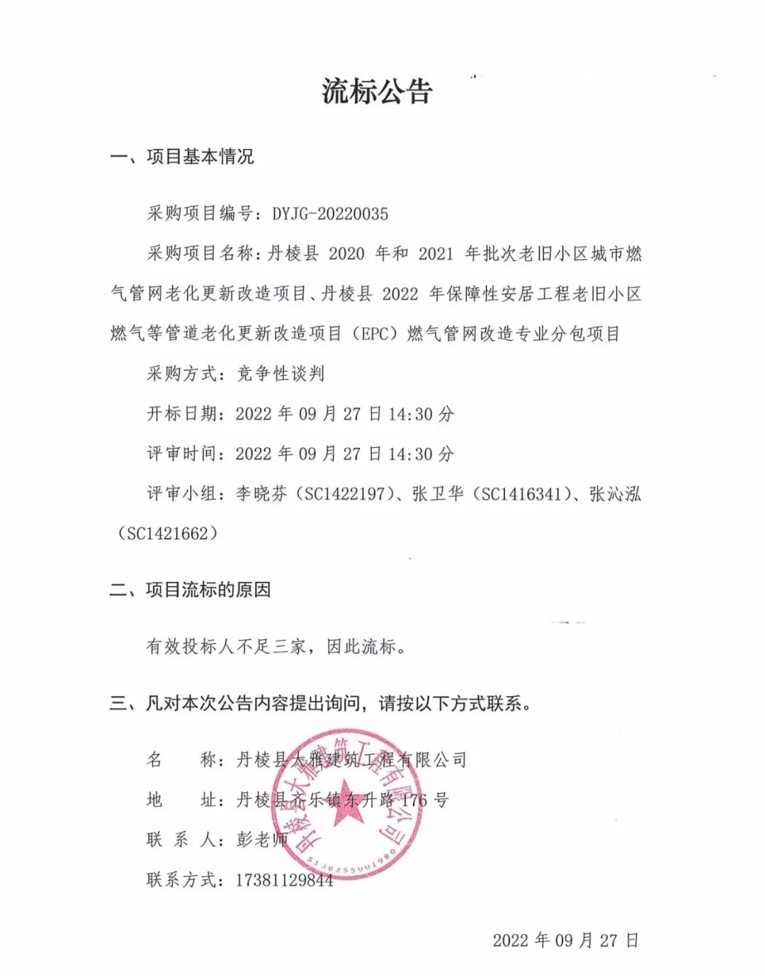 丹棱縣 2020 年、2021年及2022年批次老舊小區(qū)城市燃?xì)夤芫W(wǎng)老化更新改造項(xiàng)目燃?xì)夤芫W(wǎng)改造專業(yè)分包項(xiàng)目流標(biāo)公告