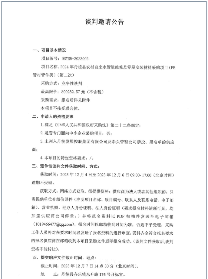 2024年丹棱縣農(nóng)村自來水管道維修及零星安裝材料采購項目(PE管材管件類)(第二次)談判邀請公告