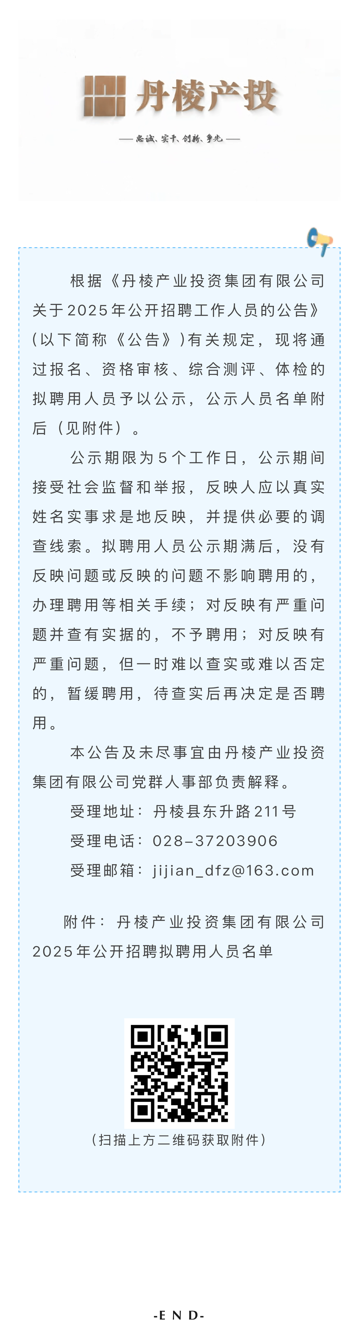 丹棱產(chǎn)業(yè)投資集團(tuán)有限公司關(guān)于2025年公開(kāi)招聘擬聘用人員的公示