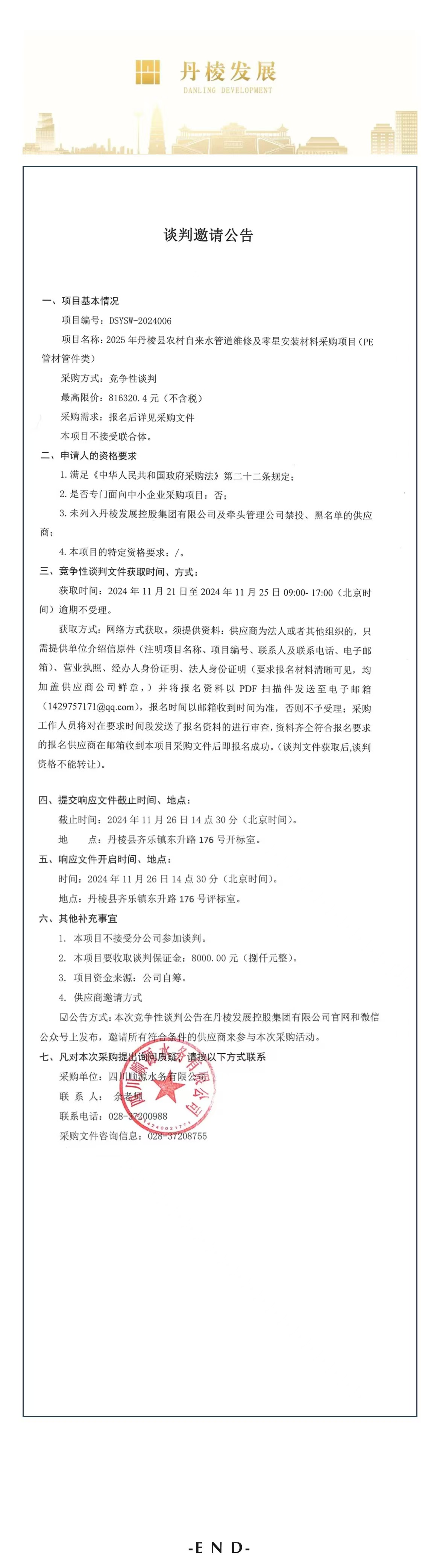 2025年丹棱縣農(nóng)村自來(lái)水管道維修及零星安裝材料采購(gòu)項(xiàng)目(PE管材管件類)談判邀請(qǐng)公告