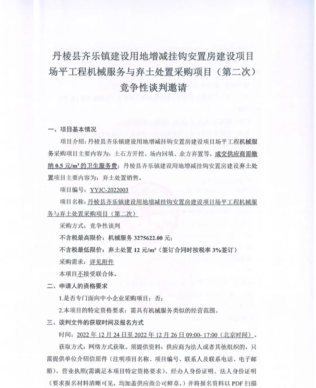 丹棱縣齊樂鎮(zhèn)建設(shè)用地增減掛鉤安置房建設(shè)項目場平工程機械服務(wù)與棄土處置采購項目(第二次)競爭性談判邀請