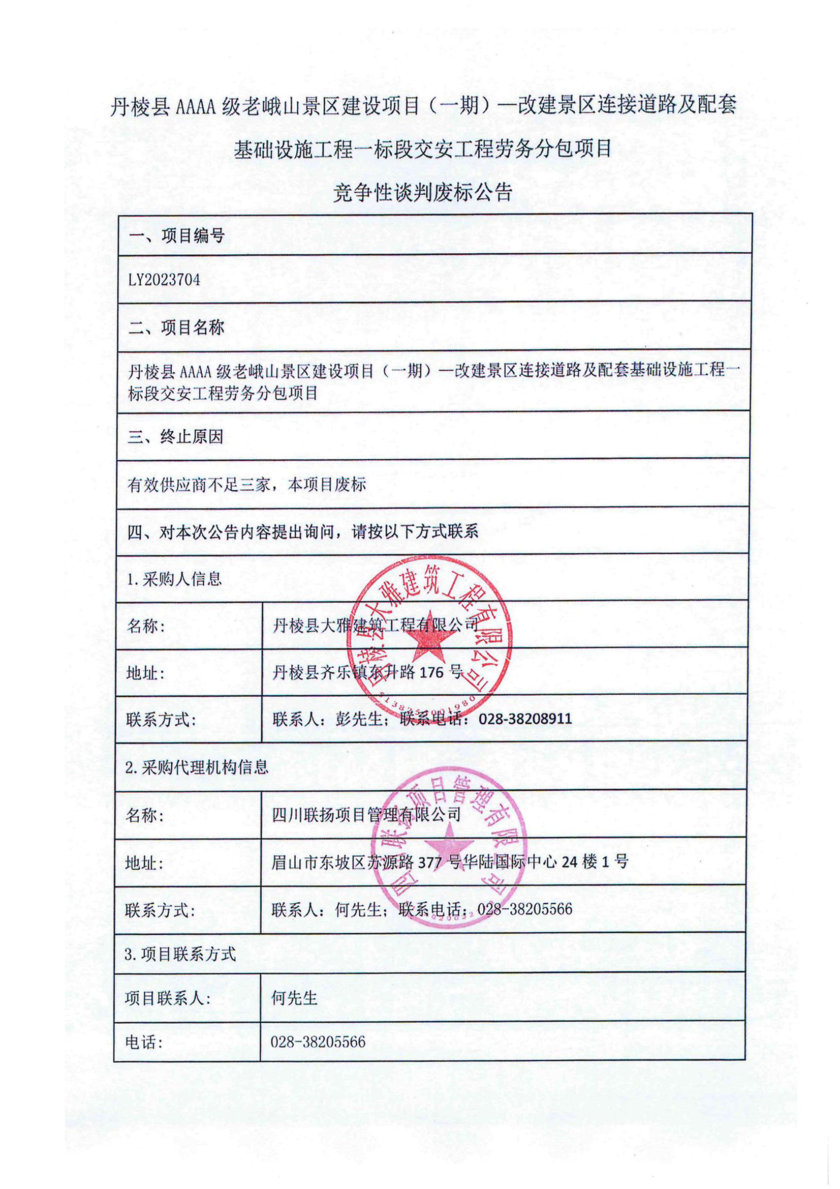 丹棱縣AAAA級(jí)老峨山景區(qū)建設(shè)項(xiàng)目(一期)一改建景區(qū)連接道路及配套基礎(chǔ)設(shè)施工程一標(biāo)段交安工程勞務(wù)分包項(xiàng)目競爭性談判廢標(biāo)公告
