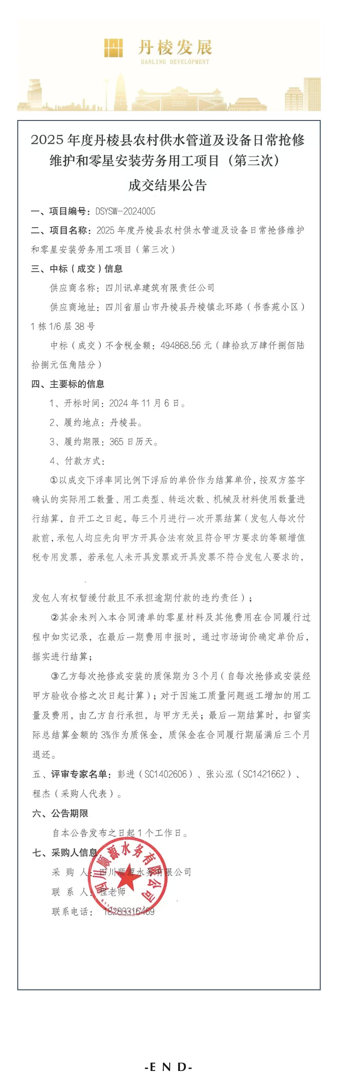2025年度丹棱縣農(nóng)村供水管道及設(shè)備日常搶修維護(hù)和零星安裝勞務(wù)用工項(xiàng)目(第三次)成交結(jié)果公告