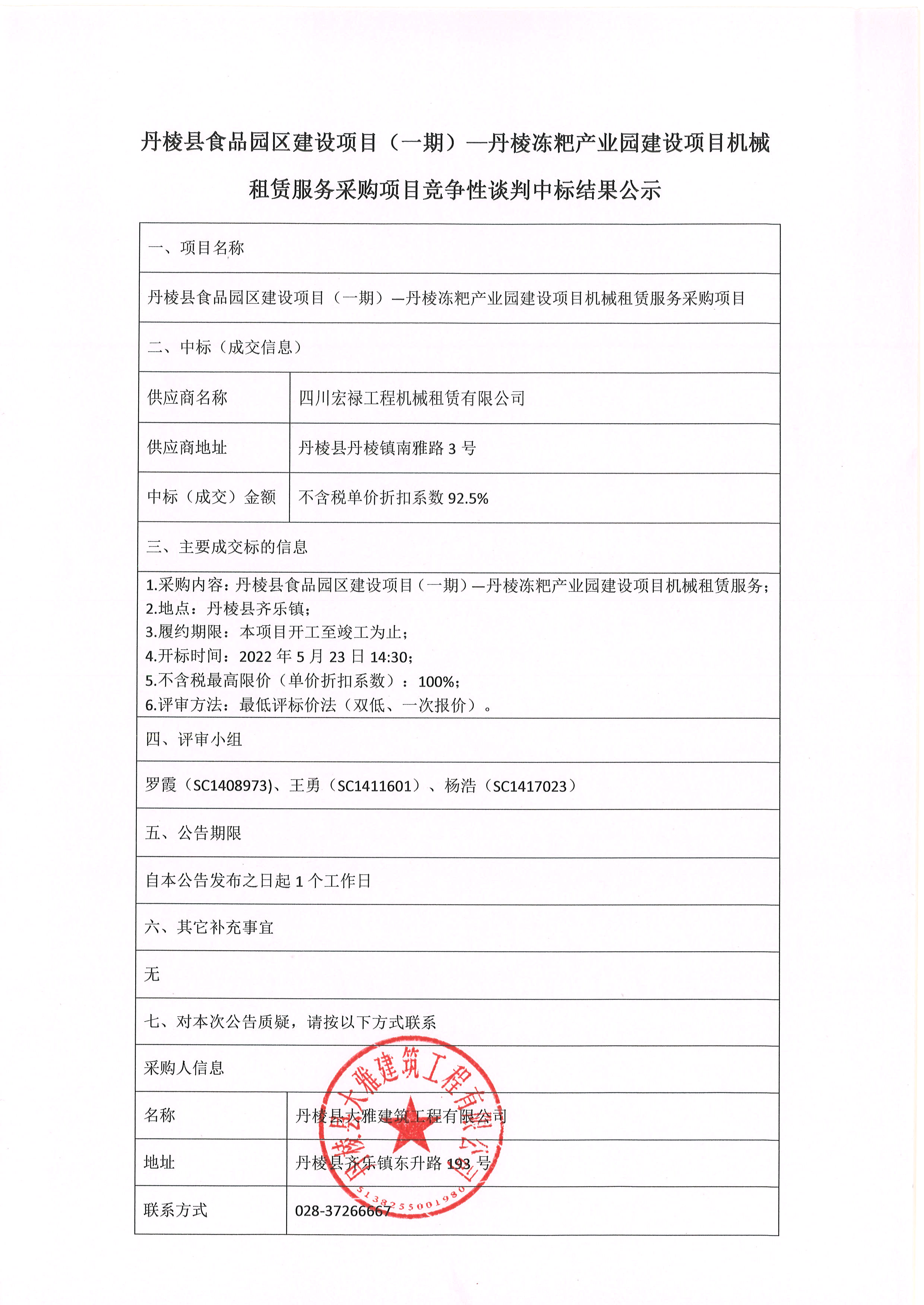 丹棱縣食品園區(qū)建設項目(一期)-丹棱凍粑產業(yè)園建設項目機械 租賃服務采購項目競爭性談判中標結果公示