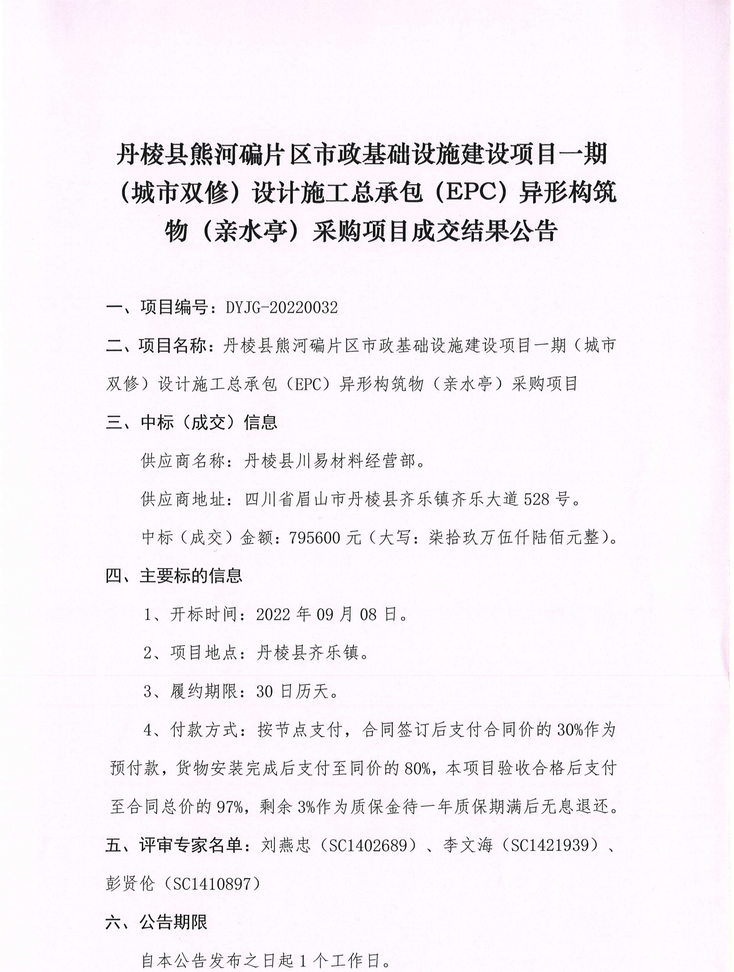 丹棱縣熊河碥片區(qū)市政基礎(chǔ)設(shè)施建設(shè)項(xiàng)目一期(城市雙修)設(shè)計(jì)施工總承包(EPC)異形構(gòu)筑物(親水亭)采購(gòu)項(xiàng)目成交結(jié)果公告