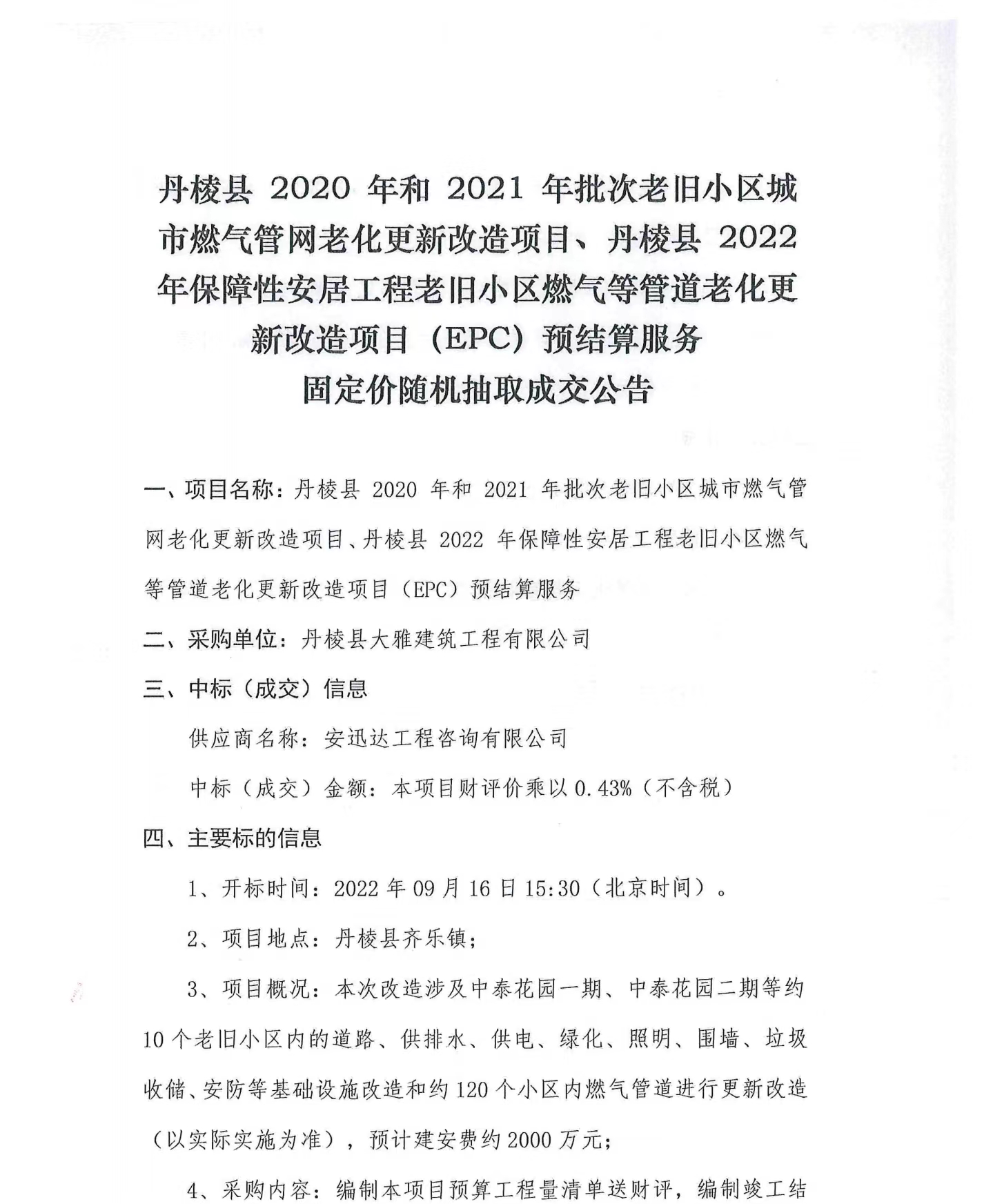 丹棱縣 2020 年、2021年及2022年批次老舊小區(qū)城市燃?xì)夤芫W(wǎng)老化更新改造項目預(yù)結(jié)算服務(wù)固定價隨機(jī)抽取成交公告