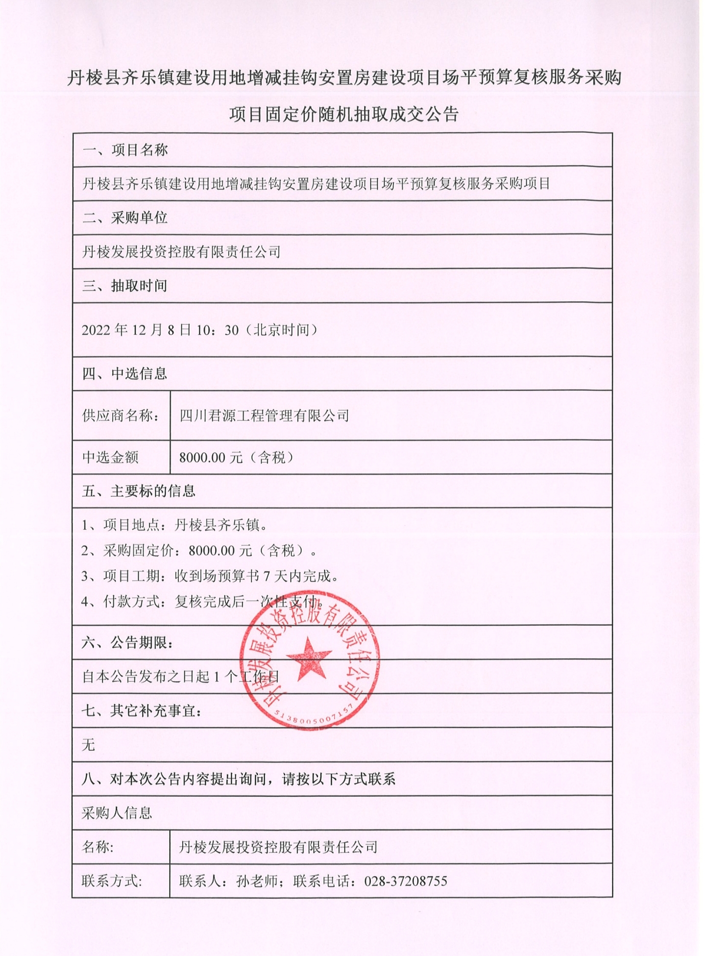 丹棱縣齊樂鎮(zhèn)建設(shè)用地增減掛鉤安置房建設(shè)項目場平預(yù)算復(fù)核服務(wù)采購項目固定價隨機抽取成交公告