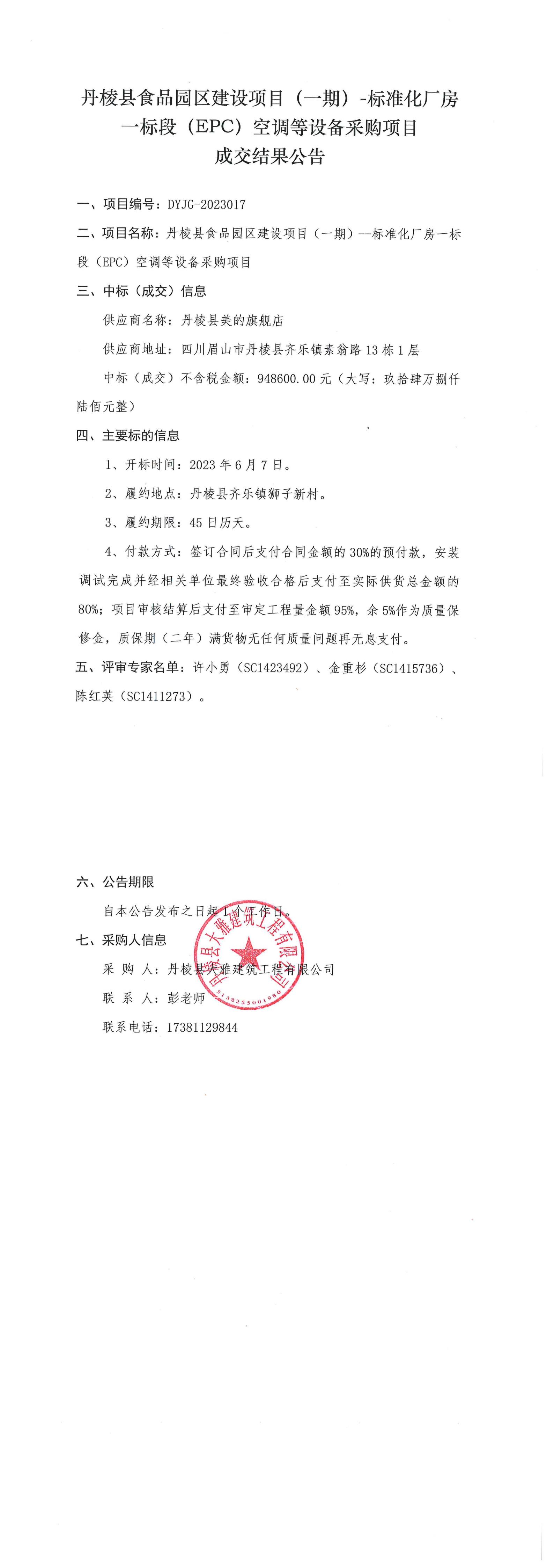 丹棱縣食品園區(qū)建設(shè)項(xiàng)目(一期)-標(biāo)準(zhǔn)化廠房一標(biāo)段(EPC)空調(diào)等設(shè)備采購項(xiàng)目成交結(jié)果公告