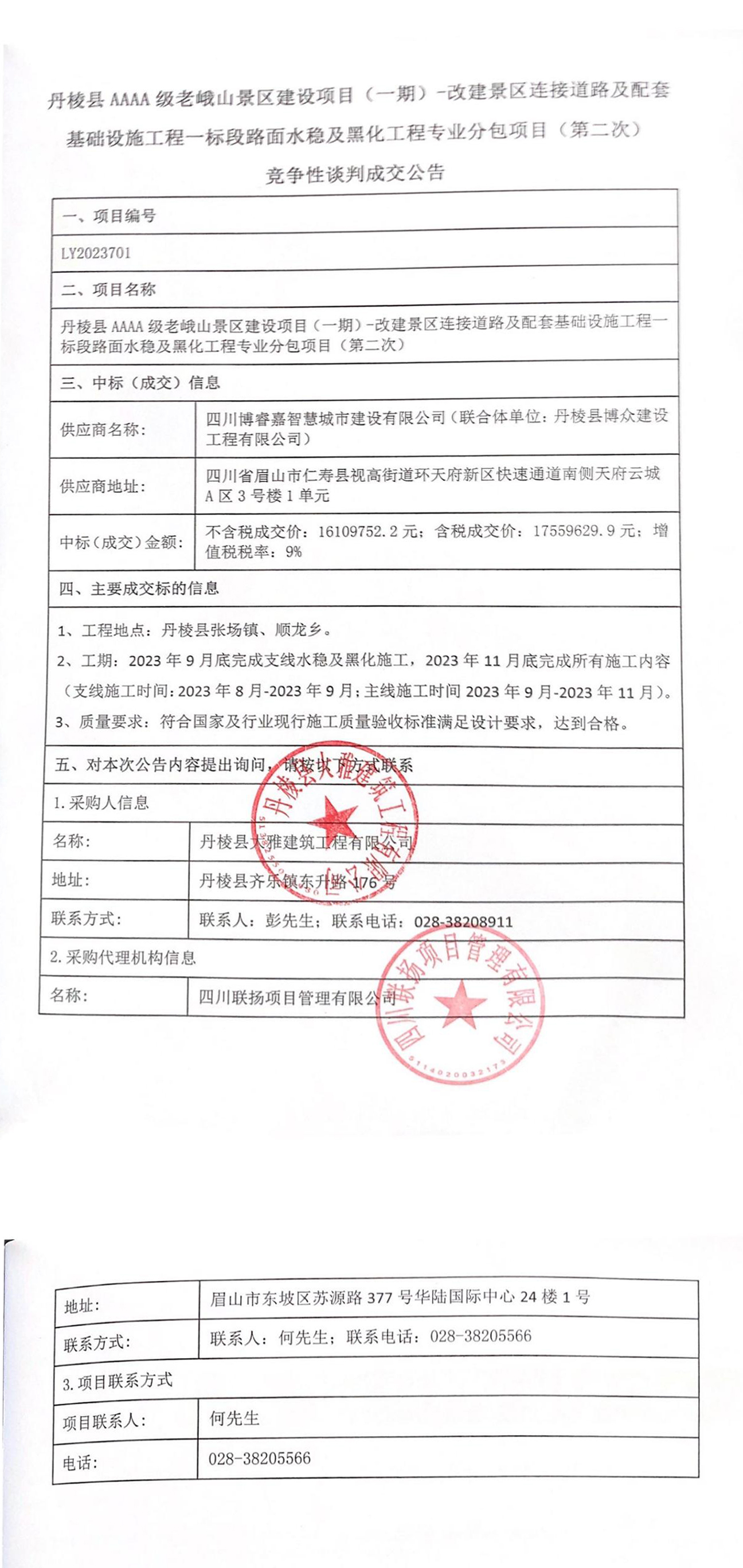 丹棱縣AAAA級老峨山景區(qū)建設(shè)項目(一期)—改建景區(qū)連接道路及配套基礎(chǔ)設(shè)施工程一標段路面水穩(wěn)及黑化工程專業(yè)分包項目成交公告