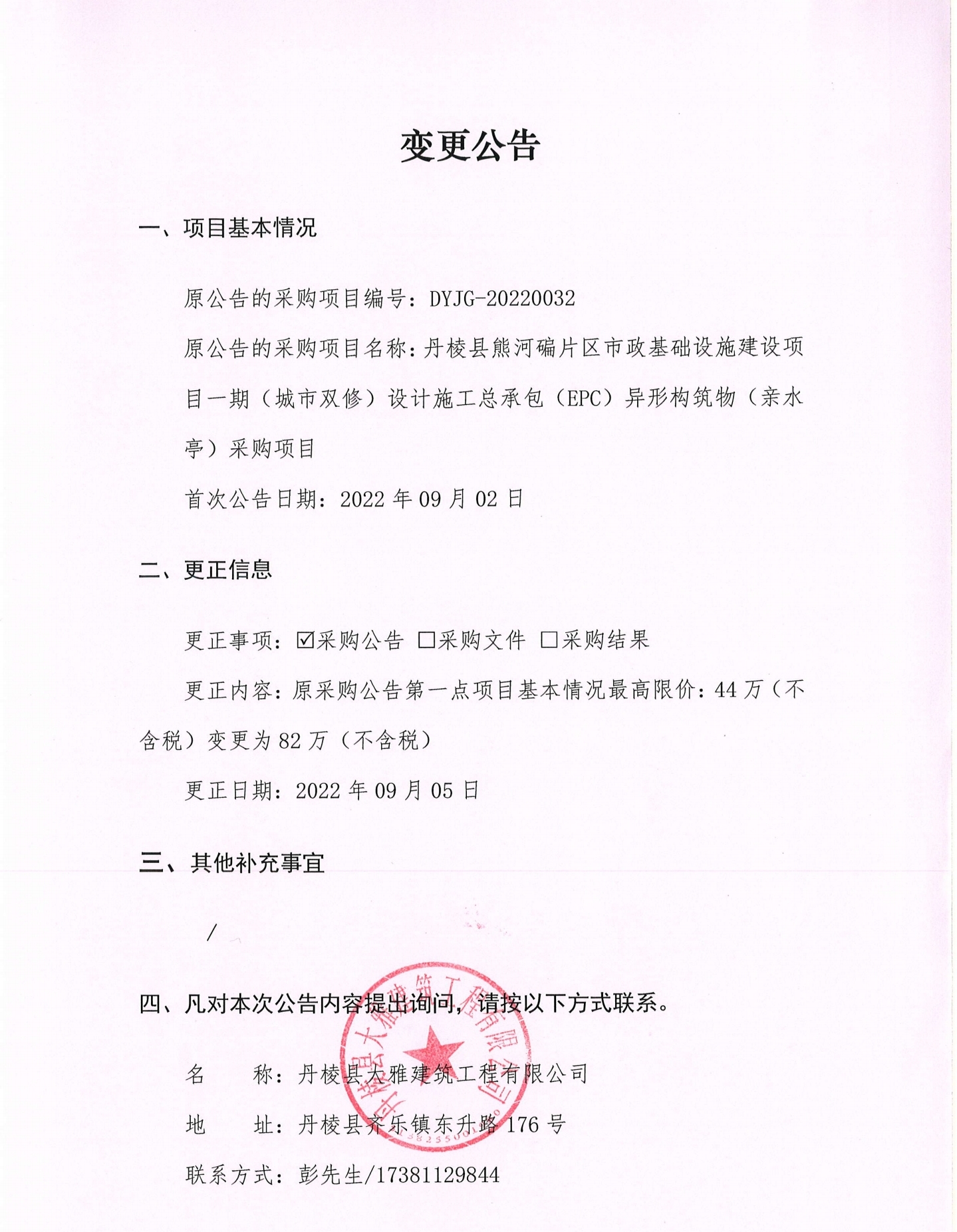 丹棱縣熊河碥片區(qū)市政基礎(chǔ)設(shè)施建設(shè)項(xiàng)目一期(城市雙修)設(shè)計(jì)施工總承包(EPC)異形構(gòu)筑物(親水亭)采購項(xiàng)目變更公告